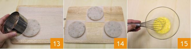 Remove the cutter 13 and cut the parchment paper around the burgers, making it easier to lift them without risking breaking them 14. Now move on to the breading: beat the eggs with salt and pepper 15.