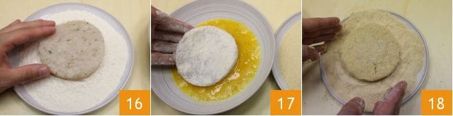 Start breading the fish burgers by first passing them in flour 16, then in the eggs 17, and finally in the breadcrumbs 18.