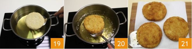 Place a pot with vegetable oil on the stove and heat the oil to 320°F-340°F, use a slotted spoon to immerse the fish burgers 19, cook for 4 minutes per side to create a golden crust on the burger (alternatively, you can bake the fish burgers in a static oven at 350°F for 25-30 minutes or in a convection oven at 320°F for about 20 minutes). Once cooked, drain the burgers 20 and place them on paper towels to absorb the excess oil 21. Your fish burgers are ready to be served hot!