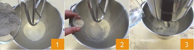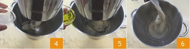 To prepare the burnt wheat focaccia stuffed with olives and sun-dried tomatoes, start with the focaccia dough. In the stand mixer with the hook attachment, pour in the two types of flour 1 and add the yeast 2 and water 3, reserving just enough to dissolve the salt. Begin mixing.