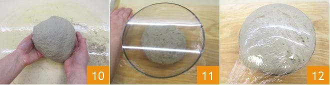Turn the dough bundle smooth side up 10 and transfer it to an oil-greased bowl, and cover with plastic wrap 11. Let it rise at a temperature of 82°F for 1 hour, then transfer it to the fridge overnight. After the rising time, the dough will have puffed up nicely 12. Keep it at room temperature for a couple of hours before using it.