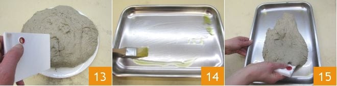After the time has passed, with the help of a dough scraper, divide the dough into two parts, one slightly larger than the other 13. Brush oil onto the baking sheet that will hold your focaccia 14, take the larger half and transfer it onto the oiled sheet 15.