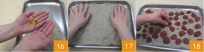 Oil your hands as well 16 and spread the base of the focaccia by pressing the dough with your fingers towards the edges of the sheet 17, until it covers it. Distribute the sun-dried tomatoes on the spread base 18.