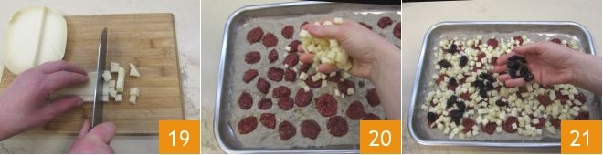 Cut the caciocavallo cheese into cubes of about 1/2 inch 19 and distribute them on the focaccia 20. Lastly, add the pitted olives 21.