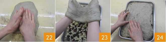 Now take the smaller half of the dough that you set aside. On the oil-greased work surface, spread the dough with your hands 22, and once stretched, lift it and lay it on the sheet 23, gently spreading it to cover the filling 24.