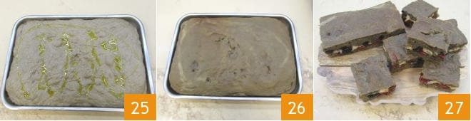 Drizzle a little oil (the remaining 2 teaspoons) over the surface of your focaccia 25 and bake it for 40 minutes in a static oven preheated to 374°F. Remove the burnt wheat focaccia stuffed with olives and sun-dried tomatoes from the oven 26 and cut it immediately into squares 27!