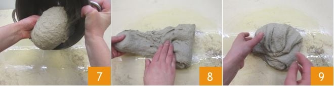 After this time, the dough will still be very soft and will not come off the sides of the mixer: with the help of a dough scraper, overturn the dough onto the well-oiled work surface 7 and work it by spreading it on the surface and then folding it onto itself first horizontally 8 and then vertically 9, until you form a bundle.