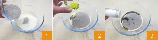 To prepare burnt wheat orecchiette, start with the preparation of the orecchiette: if you want to get ahead, you can also prepare them the day before. In a large bowl, combine the remilled semolina and burnt wheat flour 1, add the extra virgin olive oil in a thin stream 2, and the salt 3.