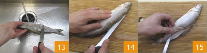 Move on to cleaning the whitefish. You can buy them already gutted from your fishmonger, so you will only need to scale them by running the sharp blade of a knife from tail to head. Perform this operation under running water to avoid spreading the scales 13. Now cut into the tail and the dorsal part of the fish along the spine 14, starting from the top, and proceed by moving the blade horizontally concerning the work surface 15.