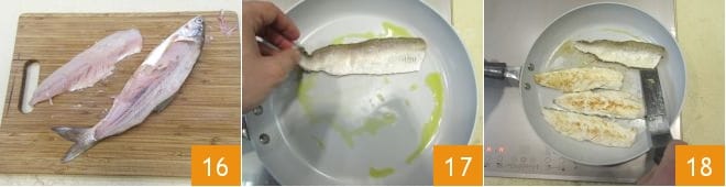 After obtaining the first fillet 16, repeat the operation on the other side to get the second, and continue this way with all the whitefish. In a large non-stick pan, heat a drizzle of extra virgin olive oil and sear the fillets first on the flesh side 17. Then turn them over to sear them on the skin side as well 18. Remove the fillets from the pan and set them aside.