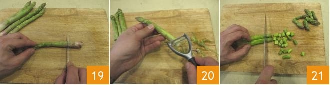 Proceed with cleaning the asparagus. After washing them thoroughly, remove the more woody white ends 19. With a vegetable peeler or gently with a small knife proceeding vertically from top to bottom, peel the stem, removing the more fibrous outer part 20. Now cut the asparagus into pieces about 0.39 inches, leaving the tips a bit longer 21.