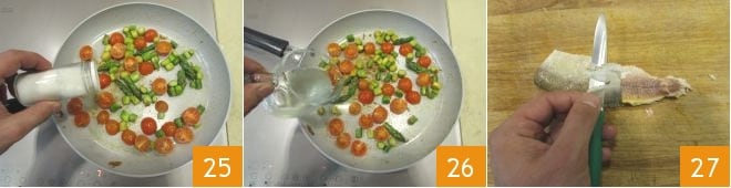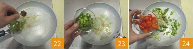 Now take the same pan you used to sear the whitefish fillets, and pour in a drizzle of oil 22. Add the asparagus 23 and sauté them over moderate heat for about 7 minutes: they should be only slightly softened. At this point, add the cherry tomatoes cut in half 24.