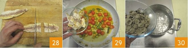 Cut the fish into not too small pieces 28 and add them to the pan. Now cook the orecchiette 30 in plenty of salted water for about 12-15 minutes. The cooking time of homemade pasta can vary greatly, so taste to check for the desired degree of doneness.