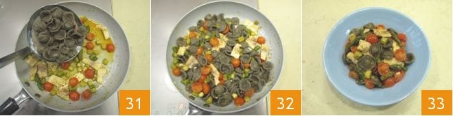 Drain your orecchiette and add them to the pan 31. Sauté the pasta in the dressing for a few minutes, allowing the flavors to blend better 32. The burnt wheat orecchiette with whitefish and asparagus are ready to be enjoyed 33!