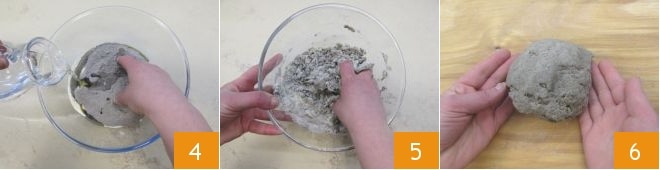 Also pour in the cold water 4 and start kneading 5. Transfer the dough onto a work surface and continue to work it until it is very smooth and rather firm 6.