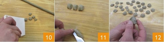 Now cut the pasta tubes into pieces about 0.39 inches 10. With a knife with a rounded tip, drag each piece of pasta on the work surface so that the pasta curves, taking on the shape of a shell 10. During this operation, keep one side of the piece of pasta stationary with the other hand 11. At this point, place each shell on the tip of your thumb and flip it backward 12 to obtain your orecchiette. Continue this way until the dough is finished. Your orecchiette are ready: place them on a floured work surface and let them dry until ready to use.