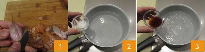 To make the cabbage and shallot salad, start by peeling the shallots 1, then heat water with a pinch of coarse salt 2 and red wine vinegar 3 in a saucepan.