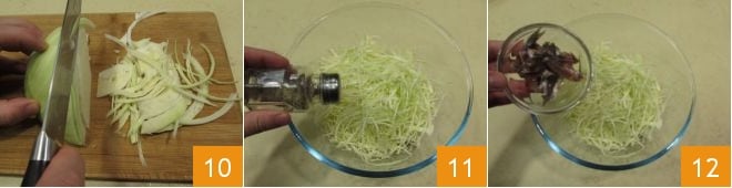 Thinly slice the cabbage into strips 10. Place the cabbage in a bowl and season with a little salt (you can also omit it since the anchovies provide a strong flavor), pepper 11 then add the cleaned anchovy fillets 12