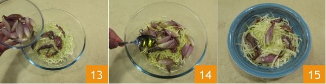 Also add the shallot wedges 13 and season with olive oil 14. Your cabbage and shallot salad is ready to be served 15.