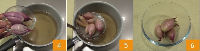 Add the shallots 4 and boil them for 5 minutes. Then drain the shallots using a slotted spoon 5 and transfer them to a small bowl 6.