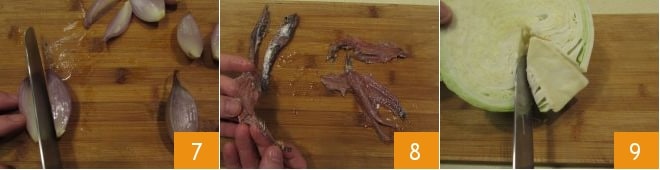 Let them cool slightly, then cut the shallots into wedges 7; next, deal with the salted anchovies: scrape off the excess salt with a knife, then cut them in half lengthwise and remove the central bone 8, at this point rinse the anchovy fillets under running water. Take the cabbage: we used white cabbage, but you can also use savoy cabbage if you prefer; cut it in half, remove the core at the center, which is the hardest part 9.