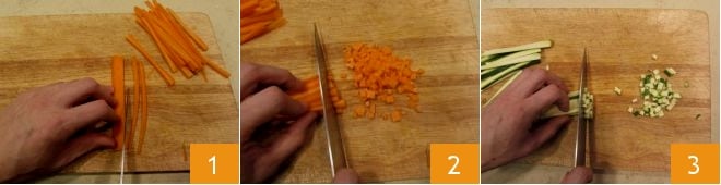 To prepare the cabbage rolls stuffed with vegetables, begin with the filling: wash the vegetables under plenty of running water, peel the carrots, cut them into strips 1 and into 1/4 inch cubes 2. Do the same with the zucchini, always cutting them into cubes of the same size 3.