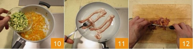 Add the diced zucchini 10 and cook for another 4-5 minutes, seasoning with salt and pepper to taste. In the meantime, in a separate pan, brown 3/4 oz of smoked bacon for about 3 minutes 11; when it is crispy, turn off the heat and thinly slice the strips with a knife 12.