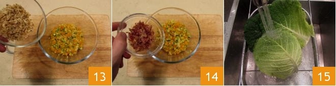 Once ready, divide the vegetables into 2 equal parts placing them in 2 small bowls. In both containers, add the chopped walnuts 13 and in one, the previously sliced bacon 14. At this point, peel the cabbage and wash 9 leaves under plenty of cold running water 15;