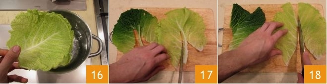 place a pot with salted water on the stove and boil the cabbage leaves for 5 minutes 16. After blanching the leaves, drain them and let them cool on a tray. Then remove the central vein by cutting a triangle with a knife 17, then divide the leaves in half 18;