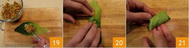 Now you can proceed to prepare the rolls, starting with the meat ones: place a spoonful of filling in the center of each cabbage leaf 19; with your hands, gently roll the roll 20, closing it like a package 21.