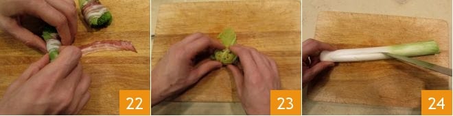 Wrap it with a slice of smoked bacon set aside earlier 22. Once you've finished the meat rolls, proceed with the vegetable ones: place a spoonful of filling on the leaf and close it like a package 23. Slice the leek 24