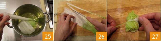 and blanch a leaf for 2 minutes in hot water 25; drain and let it cool completely. With a knife, cut threads 1/4 inch wide 26 to close the rolls by tying a small knot 27.