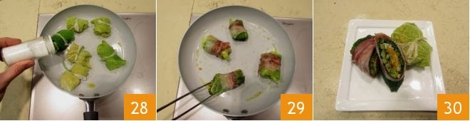 Place a non-stick pan on the stove with a drizzle of oil and sear the vegetable rolls first for 1 minute per side, then the meat ones, seasoning with salt 28 and turning them with kitchen tongs for even cooking 29. When they have taken on color, you can serve and enjoy your hot cabbage rolls stuffed with vegetables 30!