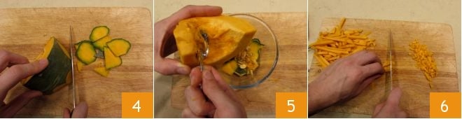 Now proceed with cleaning the pumpkin: slice it, remove the peel 4, and clean the internal filaments and seeds 5, then cut it into 1/4 inch cubes as well 6. You should obtain 3 1/2 ounces of cleaned pumpkin pulp.