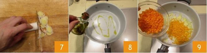 Slice the leek 7 and sauté it in a large non-stick pan with the oil 8 along with the pumpkin and carrot cubes 9 for 4 minutes, stirring with a spatula.