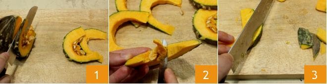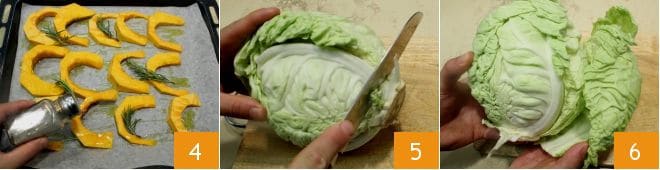 To prepare the pumpkin cabbage rolls, start with the pumpkin. Cut the pumpkin into slices about 3/4 inch thick 1, remove the seeds and stringy part 2, and peel the skin 3.