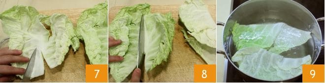 Remove the central part of the leaves, which is the hardest 7, and divide them in half 8. Blanch the cabbage leaves for about 1 minute in boiling salted water 9.