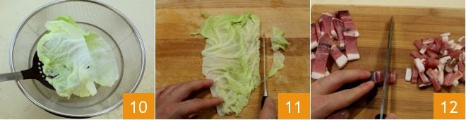 Then drain them with a slotted spoon and place them on a strainer 10. Trim the cabbage leaves to create a rather regular rectangle 11. Now move on to the bacon: cut it into strips and then into cubes about 1/5 inch 12.