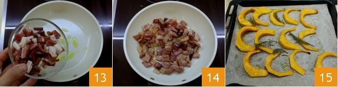 Then drizzle a small pan with a little oil and add the bacon cubes to sauté for about 5-10 minutes 13. When the fatty part has slightly melted and the bacon has colored, turn off the heat 14. Meanwhile, take the pumpkin out of the oven, which will have softened and flavored 15.