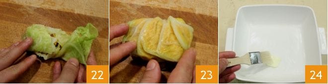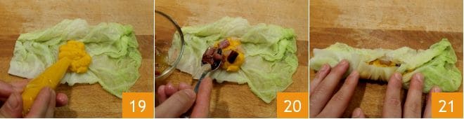 Now you can start composing your rolls: put a little pumpkin pulp in the center of each cabbage leaf 19, then add a teaspoon of bacon cubes 20 and fold it into a packet like this: fold the longer sides of the leaves towards the center 21,