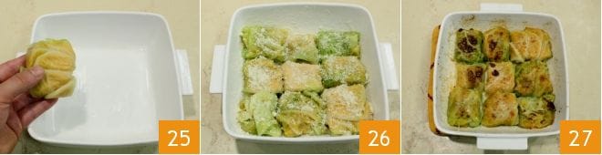 Then start arranging the rolls in the baking dish 25. Sprinkle them with grated Grana Padano cheese 26 and bake them in grill mode at 430°F for 5-10 minutes. Then take them out of the oven 27 and enjoy the pumpkin cabbage rolls hot or warm!