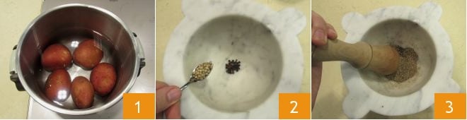 To prepare the cacio e pepe croquettes, first wash the potatoes, then place them in a saucepan with cold water 1 and boil them for about 40 minutes from when the water starts boiling, until they are soft enough to be pierced with a fork. In the meantime, place the black and white peppercorns in a mortar 2 and crush them with a pestle 3; alternatively, you can use a meat tenderizer.