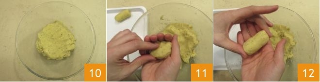 until you obtain a homogeneous mixture 10. Using a small bowl of water to keep your hands moist, take a portion of the mixture 11 and shape it into the classic cylindrical shape of croquettes, slightly flattening the ends 12; with these quantities, you should get about 20 croquettes.