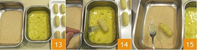 Pour the eggs and breadcrumbs for the breading into two separate containers 13: coat each croquette in the egg 14 and then in the breadcrumbs 15, then again in the egg and breadcrumbs to achieve a crunchier breading.