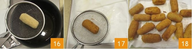 Heat the seed oil in a saucepan and bring it to a temperature of 338°F, then immerse a maximum of 2 croquettes at a time 16 and fry them for about 3 minutes until they are nicely golden. Drain the croquettes with a slotted spoon and transfer them onto a sheet of absorbent paper to remove the excess oil 17. Serve your cacio e pepe croquettes while still hot, being careful not to burn yourself 18!