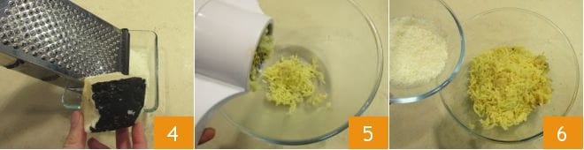 Grate the aged Pecorino cheese 4 and set aside. When the potatoes are cooked, drain them and mash them in a bowl with a potato masher 5. Once they have cooled a bit, add the grated Pecorino cheese to the bowl 6,