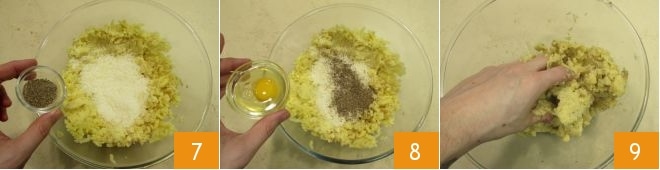the crushed peppercorns 7, and the egg 8. Mix with your hands 9