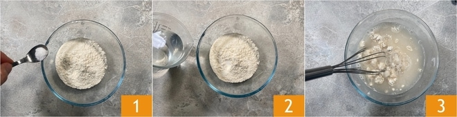To prepare the cacio e pepe supplì, start with the batter: in a bowl, pour the flour, salt 1, and water 2, then mix well with a whisk 3. Set aside.