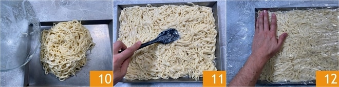 Transfer the seasoned pasta into a baking pan 10 and spread it evenly 11, then cover with cling film in contact 12. Let it return to room temperature and then place it in the refrigerator to firm up for at least 2 hours.