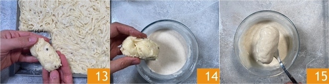 After the cooling time, take the pasta from the fridge, take a portion of the mixture with wet hands, and shape it into a cylinder 13. Dip the supplì in the batter 14 and let the excess drain with the help of a fork 15.